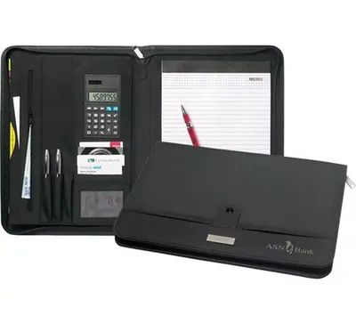 Die Schreibmappe mit Reißverschluss besteht zum Teil aus Mikrofaser. Durch die herausziehbaren Griffe wird die Schreibmappe zu einer praktischen Konferenztasche. An der Innenseite befinden sich diverse Einsteckfächer wobei eins mit einem Reißverschluss verschlossen werden kann. Die Schreibmappe ist mit einem A4 Schreibblock ausgestattet und einem 8 digits dual power Taschenrechner. Der Artikel A4 Microfiber Schreib-/ Konferenzmappe ist in folgenden Farben erhältlich: Schwarz.