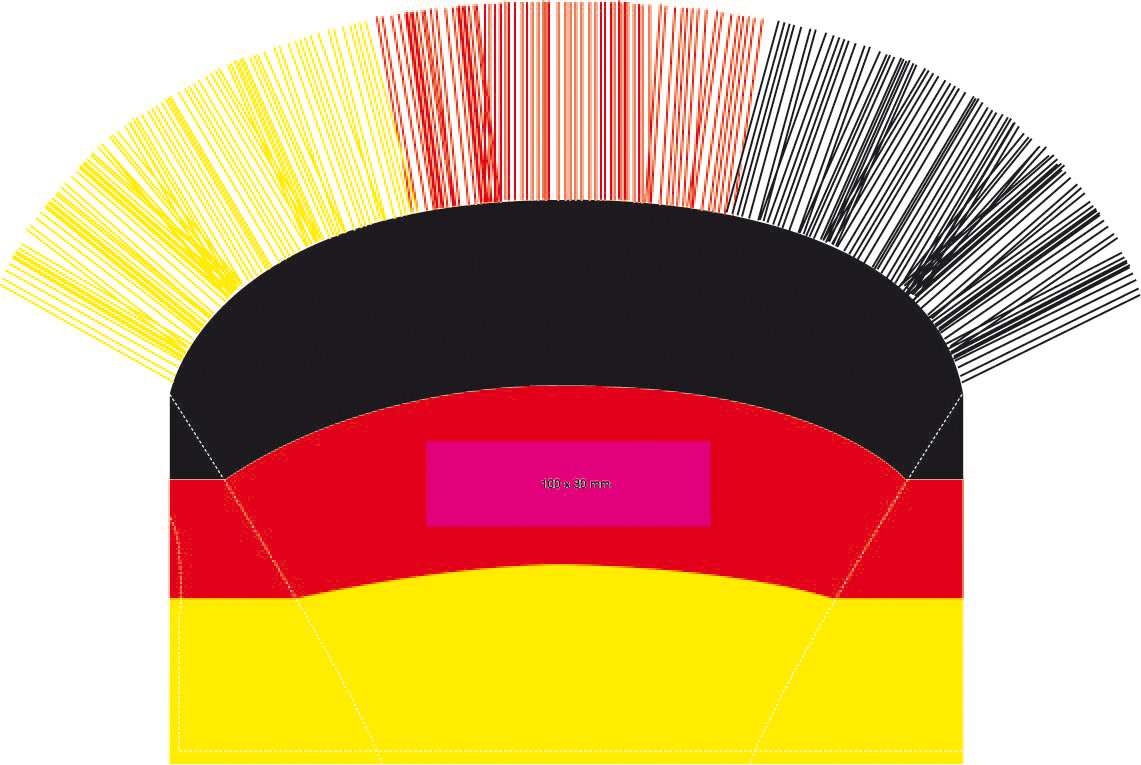Der etwas andere Hut. Leicht wattierte Kopfbedeckung aus Polyester in schwarz/rot/gelb mit Deutschland-Irokesen-Fransen. Hinten mit Schlitz und Gummizug für eine gute Passform und besseren Halt. Mützen-Durchmesser 200 mm. Der Artikel Fanhut Irokese ist in folgenden Farben erhältlich: Schwarz/Rot/Gelb.
