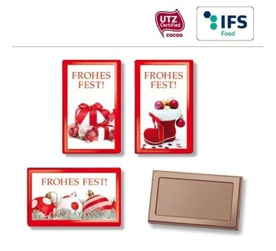 Mit Schokolade als Werbeartikel versüßen Sie Ihren Kunden den Moment. Schokolade entweder direkt bedruckt mit Ihrem Logo und/oder Werbetext oder mit Aufdruck auf der Verpackung sind nicht nur gerne bei Hotelgesten gesehen. Egal bei welcher Veranstaltung Sie Ihre Kunden geschmacklich verwöhnen möchten, Schokolade kommt immer gut an. Jetzt liegt es an Ihnen für welche Schokolade Sie sich entscheiden. Egal ob Vollmilch, Zartbitter mit Nuss oder doch die weiße Schokolade wir bieten Ihnen eine große Vielfalt an Möglichkeiten. Sie können die gewünschte Schokolade hier nicht finden? Rufen Sie uns einfach an oder schicken Sie uns eine E-Mail, gerne helfen wir Ihnen die passende Schokolade für Ihre Werbeaktion zu finden.